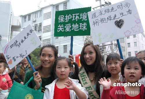 2007地球小姐世界冠軍杰西卡(中)、2006地球小姐季軍凱瑟琳與社區的孩子們在一起。 中新社發 劉建民 攝