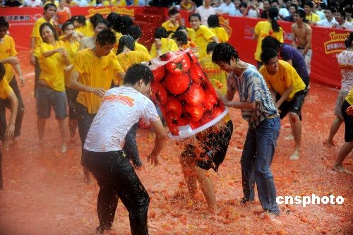10月19日,一場番茄大戰在廣東省東莞華南MALL狂熱上演。為避免砸傷事故,15噸西紅柿經過專門的軟化。此次狂歡活動吸引了上萬人觀看。游客分批進入番茄池狂砸,根本不管比賽規則,不要分數,只要開心。中新社發 許康平 攝