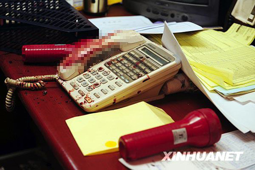 韓國首都首爾發生縱火行兇事件的旅館,管理辦公室內的電話上沾滿了被害人的鮮血。新華社/紐西斯通訊社