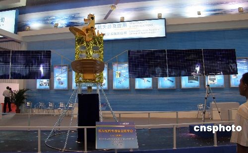 圖為中國航天科技集團公司研制的新一代通信衛星研制平臺“東方紅四號”模型在航展上展出。中新社發 孫自法 攝