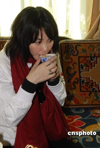 11月28日下午,王菲、李亞鵬在西藏自治區(qū)紅十字會(huì)領(lǐng)導(dǎo)陪同下,來到拉薩城關(guān)區(qū)當(dāng)巴居委會(huì),看望一歲的唇腭裂患兒小央金,并為小央金送去慰問金和禮物。首次做客藏家的王菲、李亞鵬夫婦顯得很愉快,并不時(shí)招呼現(xiàn)場記者一同品嘗具有西藏特色的綠色食品炒青稞。期間,李亞鵬在主人招呼下品嘗了西藏的青稞酒,而王菲則學(xué)喝了獨(dú)具西藏口味的酥油茶。中新社發(fā) 龍昊 攝