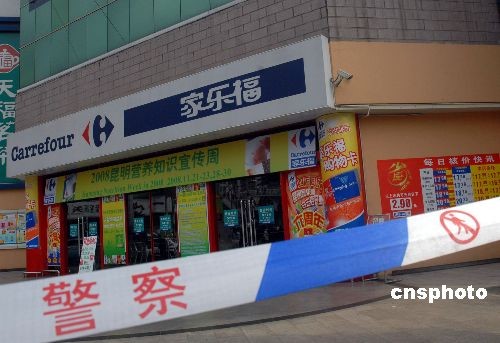 11月29日上午,云南省昆明市龍泉路家樂福超市發生人質劫持事件,3名市民被歹徒刺傷,1人被劫持。經多方談判未果,為保護人質,警方開槍擊斃歹徒。截至當日下午16時,該超市仍被警方封鎖。中新社發 史廣林 攝