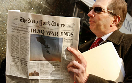 紐約一名讀者正在閱讀一份假的《紐約時報》,報紙的頭版頭條竟然是伊拉克戰爭結束。盡管報頭、字體、字型都達到了以假亂真的程度,但它仍然是“贗品”,這份由專門戲弄名人和名組織機構的“應聲蟲”組織偽造的《紐約時報》上標明的發行日期是2009年7月4日,據稱,他們是希望通過此舉達到鞭策新當選總統奧巴馬恪守承諾的目的。
