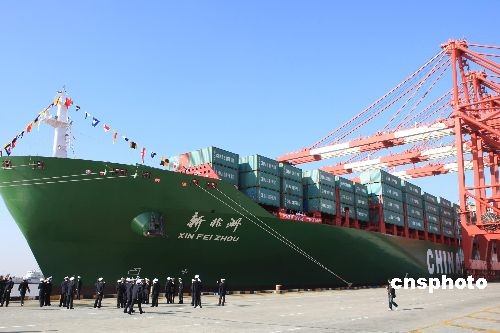海峽兩岸海上直接通航首航儀式在洋山港舉行,中遠公司的“遠河”號和中海公司的“新非洲”號從洋山港啟航執行首航任務。中新社發 湯彥俊 攝