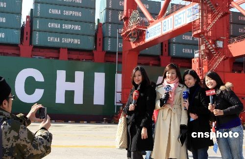 圖為前來采訪的臺灣記者在洋山港合影留念。中新社發 湯彥俊 攝