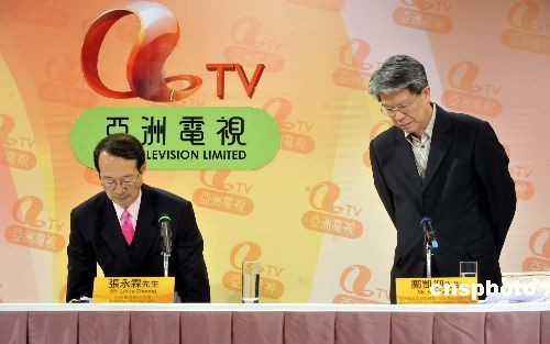 十二月十五日,香港亞洲電視執行主席張永霖(左)、高級副總裁鄺凱迎在大埔總臺舉行的記者會上稱,二零零八亞洲小姐競選賽果與投票結果不符,亞視將對此進行調查。圖為二人就事件鞠躬道歉。中新社發 鄧慶樂 攝