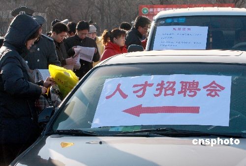 12月20日,由多家人才機構聯合舉辦的“2008年農展迎新春人才招聘會”在北京舉行。因應聘者眾多,招聘會臨時把汽車改作“售票窗口”。中新社發 鄭雄增 攝