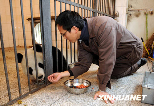 12月21日,臺(tái)北木柵動(dòng)物園飼養(yǎng)員正在學(xué)習(xí)照顧“團(tuán)團(tuán)”、“圓圓”。 從2008年10月開(kāi)始,臺(tái)北木柵動(dòng)物園的3名飼養(yǎng)員分兩批來(lái)到中國(guó)保護(hù)大熊貓研究中心四川雅安碧峰峽基地,學(xué)習(xí)大熊貓飼養(yǎng)技術(shù)。目前,他們和贈(zèng)臺(tái)大熊貓“團(tuán)團(tuán)”“圓圓”已經(jīng)建立感情,基本掌握了大熊貓飼養(yǎng)技術(shù)。