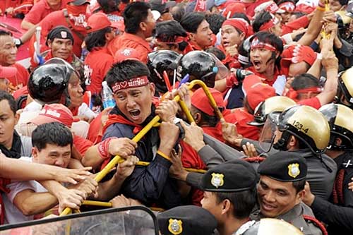 12月30日,泰國警察在為新總理阿披實(shí)開路進(jìn)入外交部時(shí)和前總理他信的支持者發(fā)生沖突。由于他信的支持者“紅衫軍”包圍國會(huì),阿披實(shí)被迫易地至外交部發(fā)表施政演講。