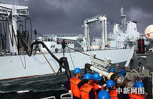 中新網“海口”艦馬六甲海峽十二月三十日電 (記者 孫自法)中國海軍赴亞丁灣、索馬里海域護航艦艇編隊,三十日下午在馬六甲海峽順利完成首次海上綜合補給。