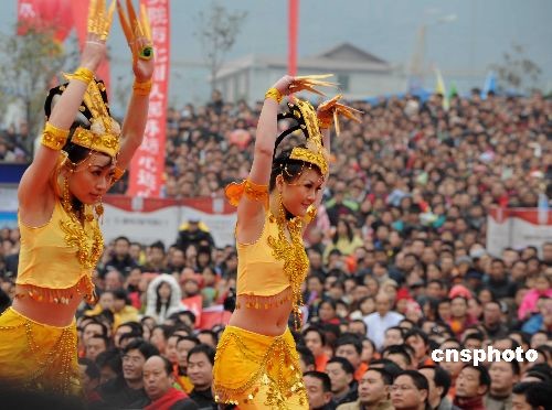 12月31日,表演“千手觀音”的業余演員,在四川大地震極重災區的擂鼓鎮慰問災民。北川縣受災的上萬民眾干部在此團聚,以迎元旦文藝表演告別難忘的2008年。中新社發 賈國榮 攝