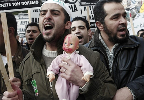 圖為希臘民眾為在空襲中死去的巴勒斯坦民眾祈禱。