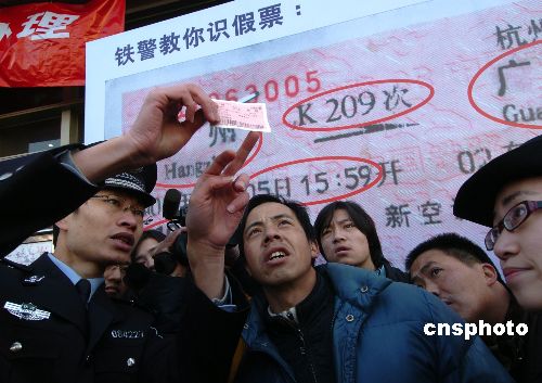 2009年1月10日,杭州鐵路公安處民警在杭州火車站售票處廣場(chǎng)教旅客識(shí)別真假火車票。春運(yùn)期間,杭州鐵路警方針為了防止旅客群眾特別是眾多農(nóng)民工朋友在購票過程中上當(dāng)受騙,根據(jù)假火車票的原型同比放大50倍制作成假票宣傳展板,在杭州火車站前教授旅客識(shí)假票知識(shí)。中新社發(fā) 施健學(xué) 攝