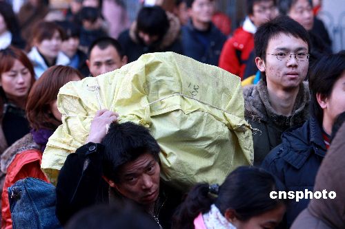 1月11日,為期40天的中國2009年春運正式開始,春運客流壓力依然很大,客流的剛性需求特征十分明顯,預計全國鐵路旅客發(fā)送量將達1.88億人,比去年同期增長8%,日均470萬人,春運“一票難求”的問題仍突出。圖為北京西站的客流不斷。