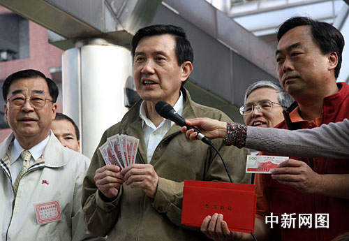 1月18日上午,備受全臺(tái)和外界關(guān)注的消費(fèi)券開始在臺(tái)灣各發(fā)放所發(fā)放。圖為馬英九今天上午九時(shí)許來到臺(tái)北市第1291號(hào)消費(fèi)券發(fā)放所領(lǐng)取消費(fèi)券。馬英九隨后發(fā)表講話,呼吁臺(tái)灣全體民眾善用消費(fèi)券,積極促進(jìn)內(nèi)需,擴(kuò)大消費(fèi)。陳立宇 攝
