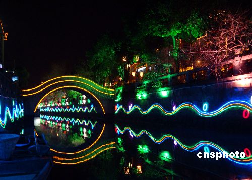 春節(jié)來(lái)臨,夜幕下的古城蘇州街頭流光溢彩,洋溢著節(jié)日氣氛。中新社發(fā) 王建康 攝