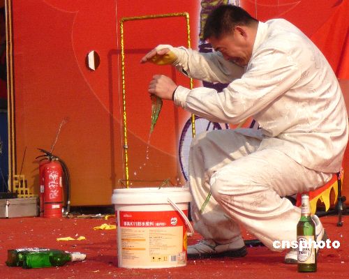 鐵砂掌擊碎啤酒瓶。中新社發 玉龍 攝