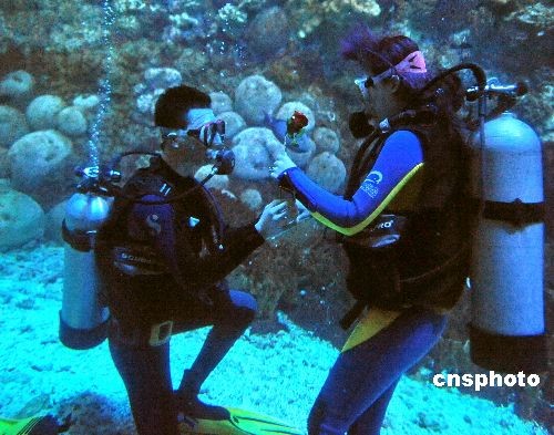 二月十四日是西方的情人節,青島極地海洋世界洄游大廳上演了一場浪漫的情人節水下定情。一對情侶手牽著手游到深達七米的水下,一位“美人魚”把貝殼中的鉆戒遞給了小伙子,小伙子鄭重的將戒指戴在姑娘的手上。兩個人緊緊的擁抱在一起,深情相吻,所有觀眾都為之鼓掌祝福。中新社發 曲連遵 攝