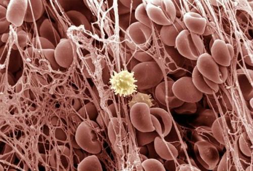 血液凝塊:這張圖看起來像是紅血球粘在了粘性網上,形成血液凝塊。位于中間的那個細胞是白血球。