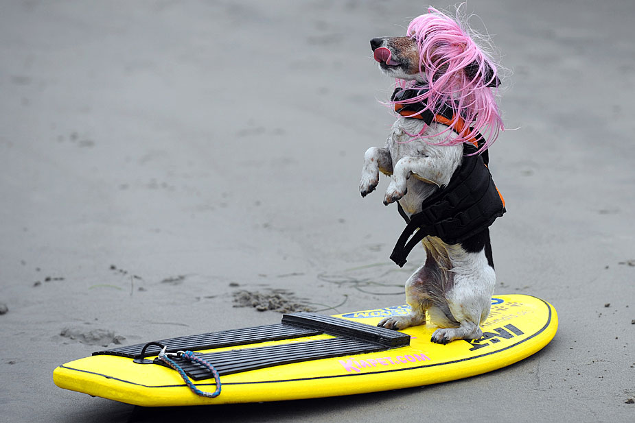 6月20日,在美國加利福尼亞州帝國沙灘舉行了一場小狗沖浪比賽,小狗們表現得十分認真。