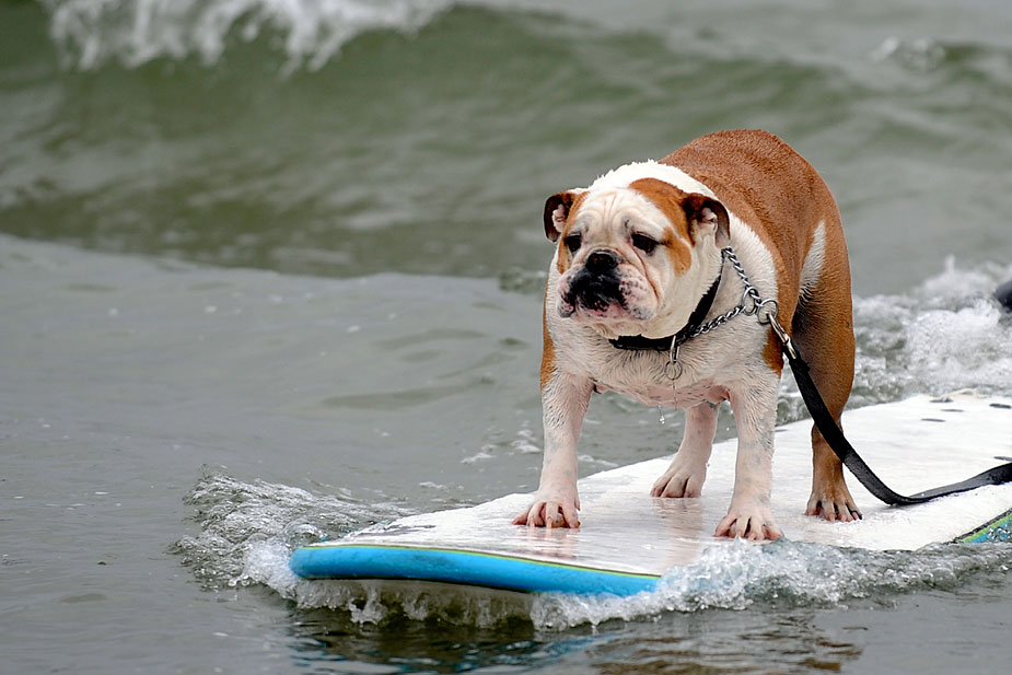 6月20日,在美國加利福尼亞州帝國沙灘舉行了一場小狗沖浪比賽,小狗們表現得十分認真。