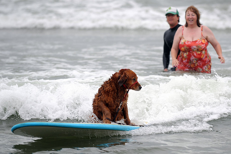 6月20日,在美國加利福尼亞州帝國沙灘舉行了一場小狗沖浪比賽,小狗們表現得十分認真。