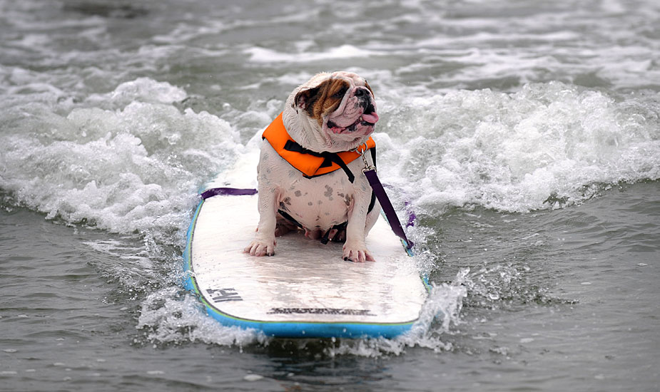6月20日,在美國加利福尼亞州帝國沙灘舉行了一場小狗沖浪比賽,小狗們表現得十分認真。