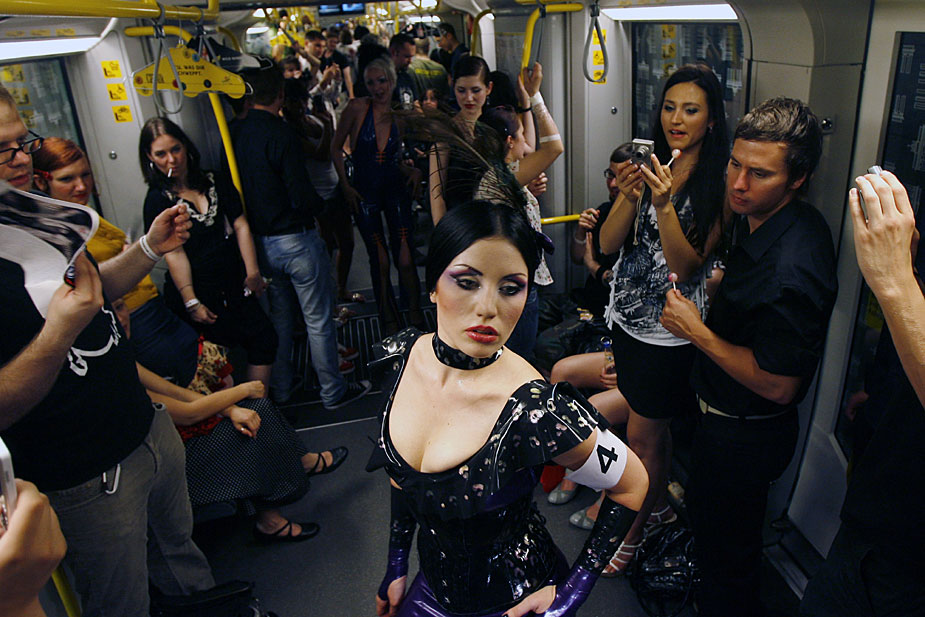 7月2日,模特在德國首都柏林的一輛地鐵上,演繹名為“地鐵上的貓步”時裝秀。