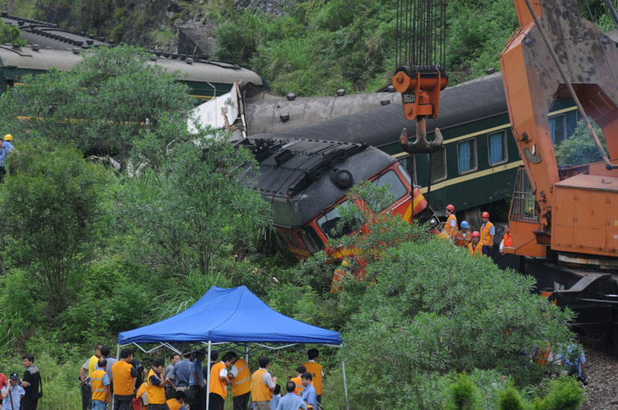 2009年7月29日4時22分,由襄樊開往湛江的1473次旅客列車運行至焦柳線廣西境內古砦至寨隆間,因連日持續強降雨造成山體崩塌掩埋線路,列車機車及機后1-4位車輛脫軌,造成4名旅客死亡,50余名旅客受傷,焦柳線中斷行車。劉柳柳 攝/CFP