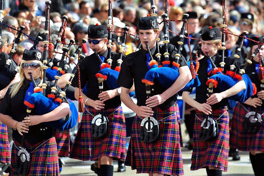8月2日,蘇格蘭梅西爾風(fēng)笛樂隊的藝術(shù)家們在洛里昂克爾特文化節(jié)上進(jìn)行表演。