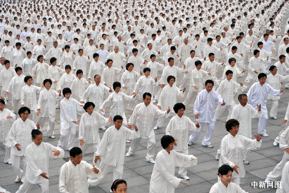 8月8日,全國首個“全民健身日”北京主會場啟動儀式上,三萬多群眾進行太極拳展示活動,在世界吉尼斯總部認證官員的見證下成功打破世界紀錄。中新網記者 金碩 攝