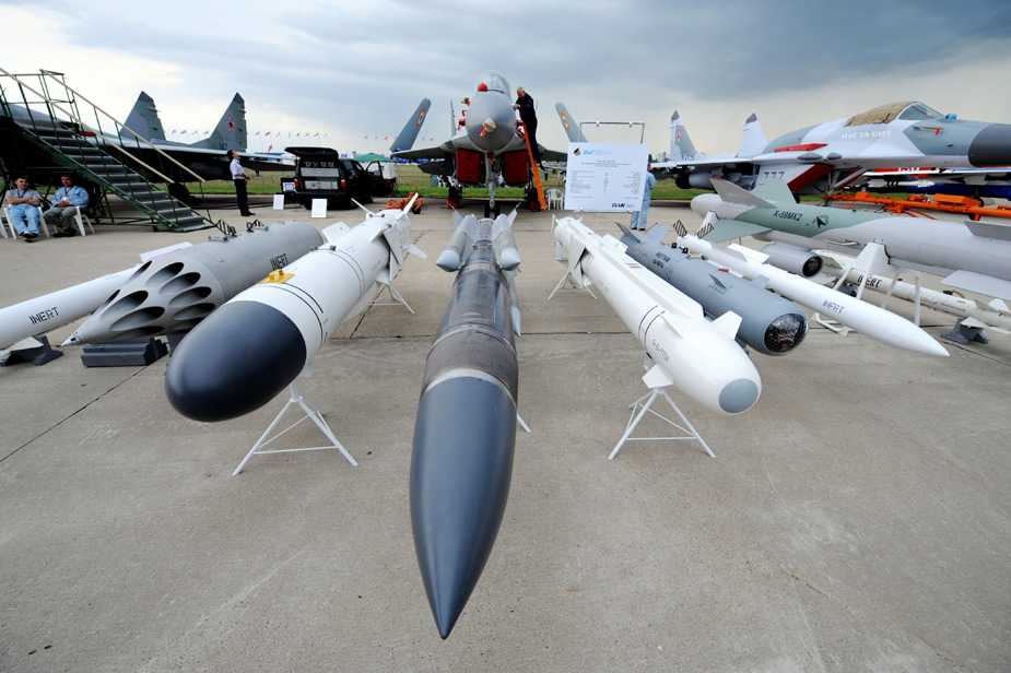 8月18日,2009莫斯科國際航空航天展(MAKS-2009)開幕。圖為展出的殲擊機和攜帶的導彈。