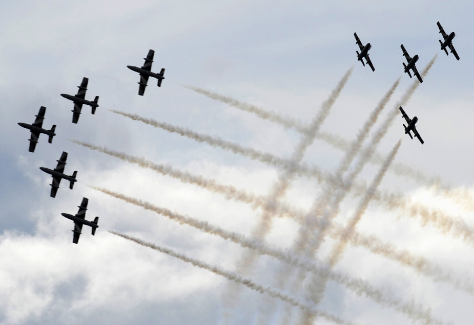 8月19日,在俄羅斯茹科夫斯基市舉行的國際航空航天展上,意大利空軍“三色箭”飛行表演隊奉獻精彩的飛行表演。