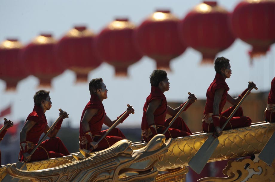 10月1日,首都各界慶祝中華人民共和國成立60周年大會在北京舉行。圖為彩車上的演員。中新社發 廖攀 攝