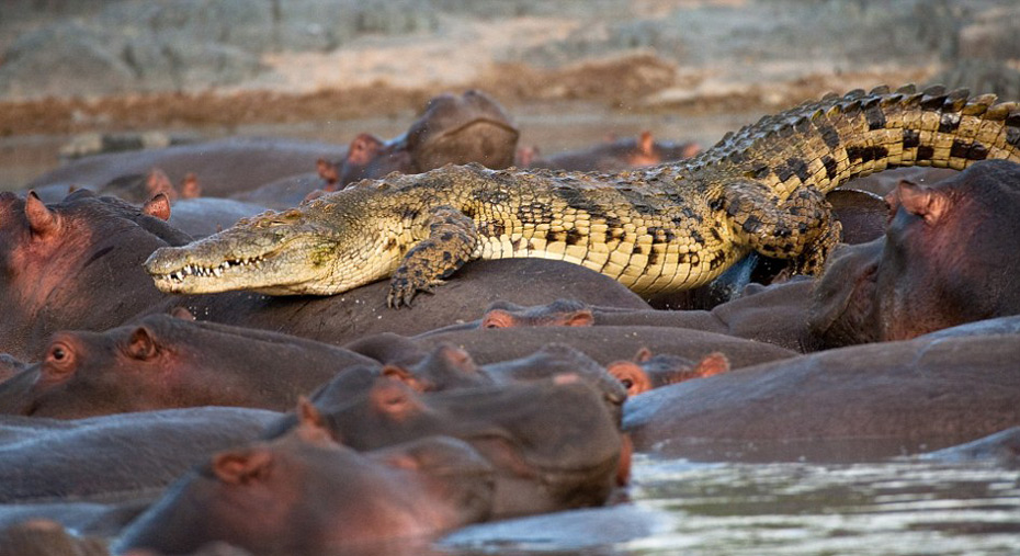 一條鱷魚悄悄混入了正在河里洗澡的河馬中,它很快就被敏感的母河馬發(fā)現(xiàn)。憤怒的河馬們立刻對(duì)它發(fā)起了猛烈地攻擊,這條冒失的鱷魚很快死于非命。