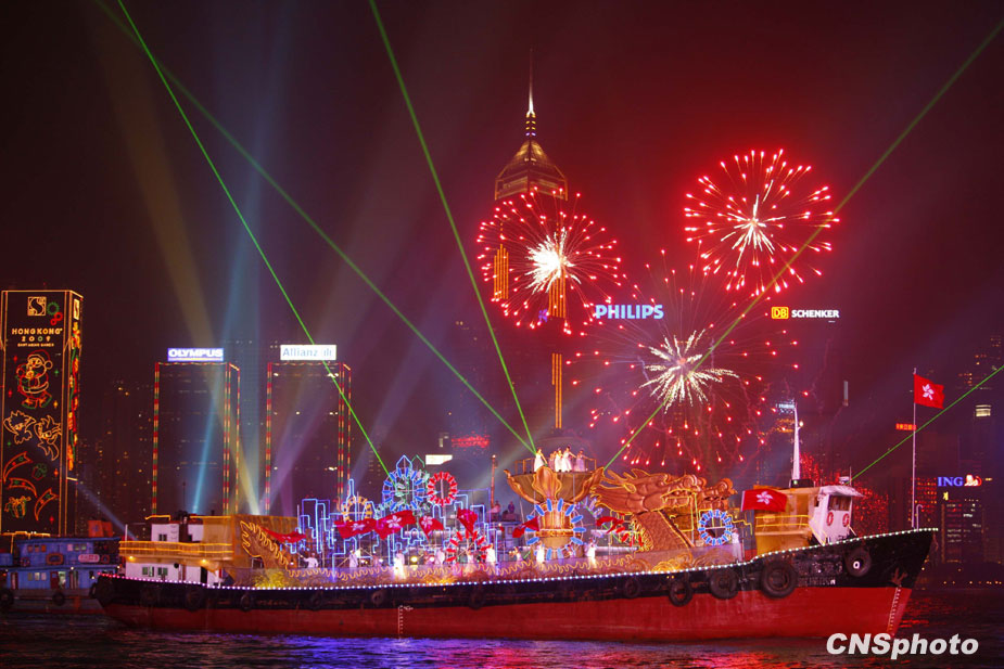 12月5日晚,第5屆東亞運(yùn)動(dòng)會(huì)開(kāi)幕式在香港維多利亞港舉行,同時(shí)配以花船巡游、燈光效果和煙花匯演,成為一屆富有特色的水上開(kāi)幕式。中新社發(fā) 盛佳鵬 攝