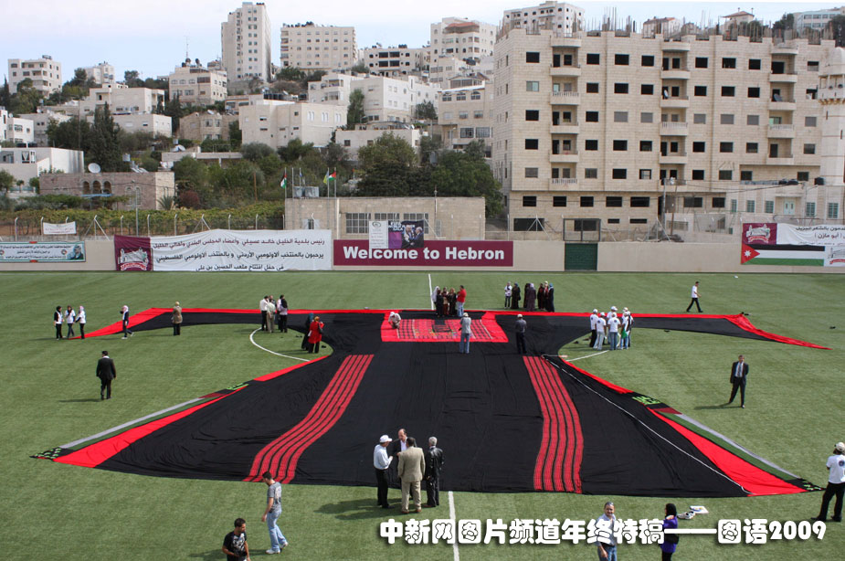世界最大的球衣:10月25日,巴勒斯坦人利用傳統刺繡工藝制作了世界上最大的球衣,并獲得了吉尼斯紀錄的認可。圖片來源:中國新聞網