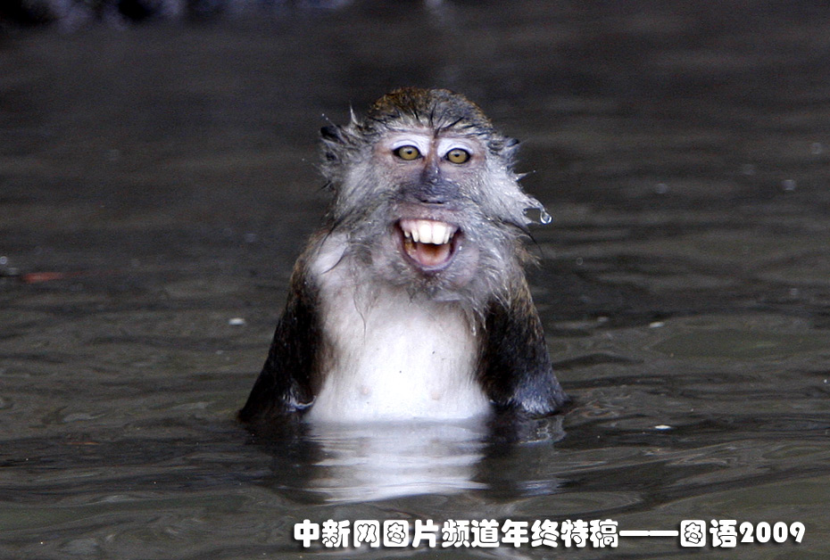馬來西亞的一個地質公園內,一只長尾獼猴在水中“大笑”。