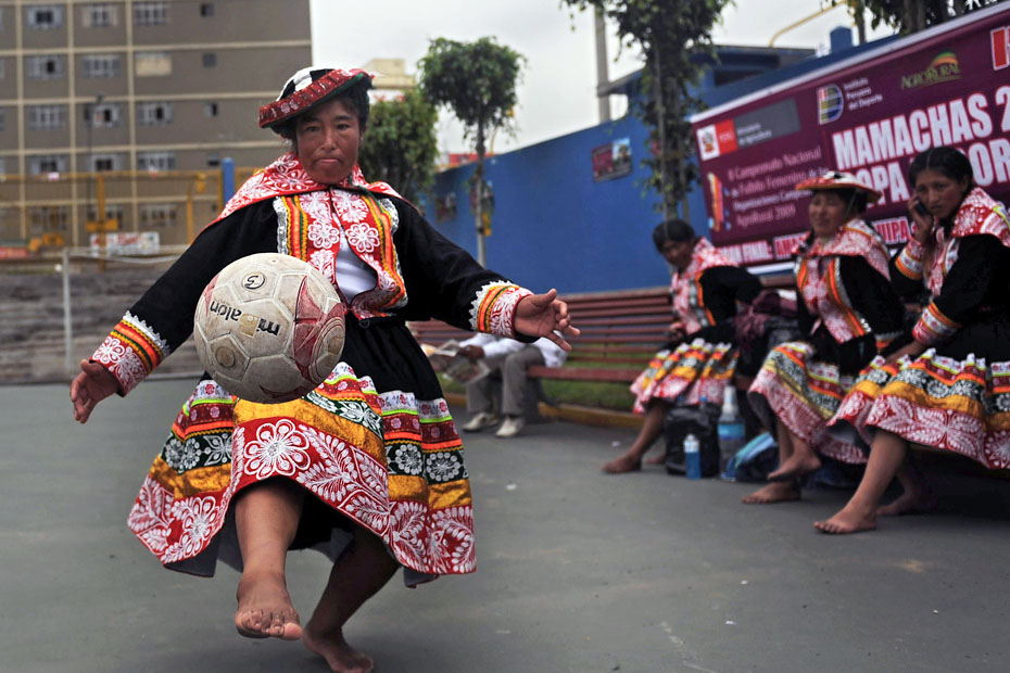 12月12日,秘魯印第安婦女在利馬國家體育場外舉辦了一場特別的足球賽,所有的球員均身著傳統服飾光腳上陣妙趣橫生。圖片來源:中國新聞網