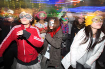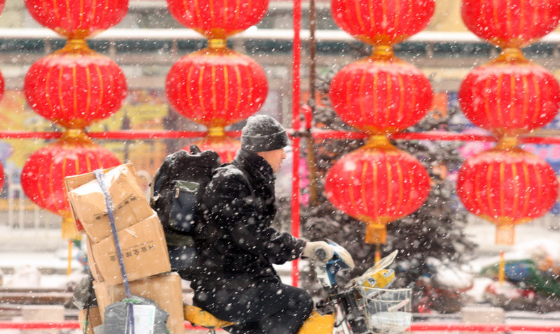 12月25日,受寒潮影響,哈爾濱大雪紛飛。圖為道里區經緯街上,市民們從紅燈籠旁經過。蘇強攝