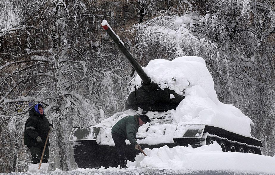 圖為12月29日,烏克蘭首都基輔的二戰紀念碑前,工作人員正在除雪。
