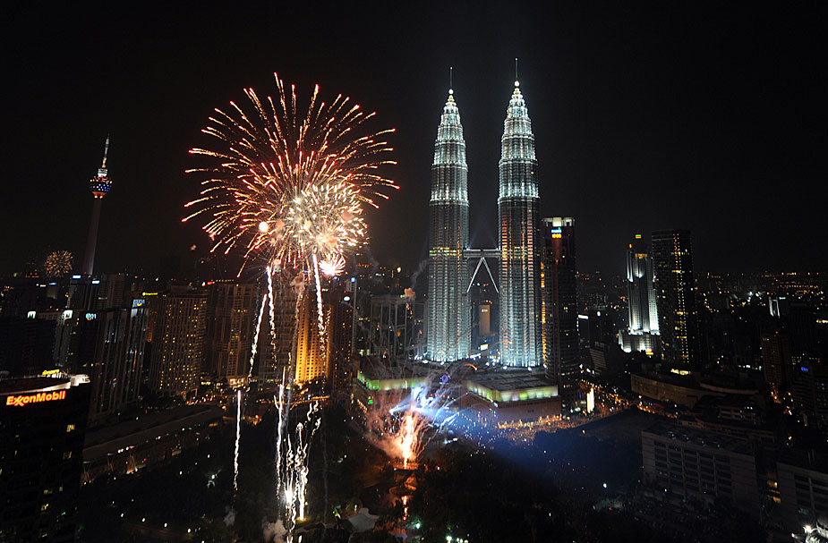 圖為2010年1月1日,馬來(lái)西亞吉隆坡的雙子星大廈前,煙花璀璨。