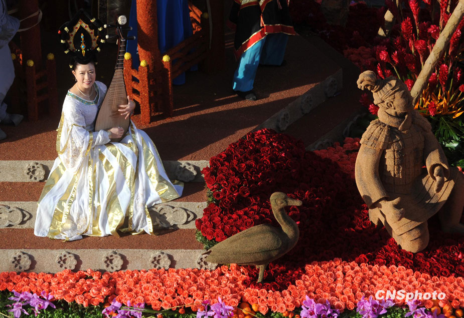 美國當地時間1月1日,第121屆美國玫瑰花車大游行在加州帕薩迪納市隆重舉行。著名影星成龍助陣中國上海世博花車。圖片來源:中國新聞網