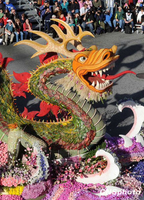 美國當地時間1月1日,第121屆美國玫瑰花車大游行在加州帕薩迪納市隆重舉行。著名影星成龍助陣中國上海世博花車。圖片來源:中國新聞網