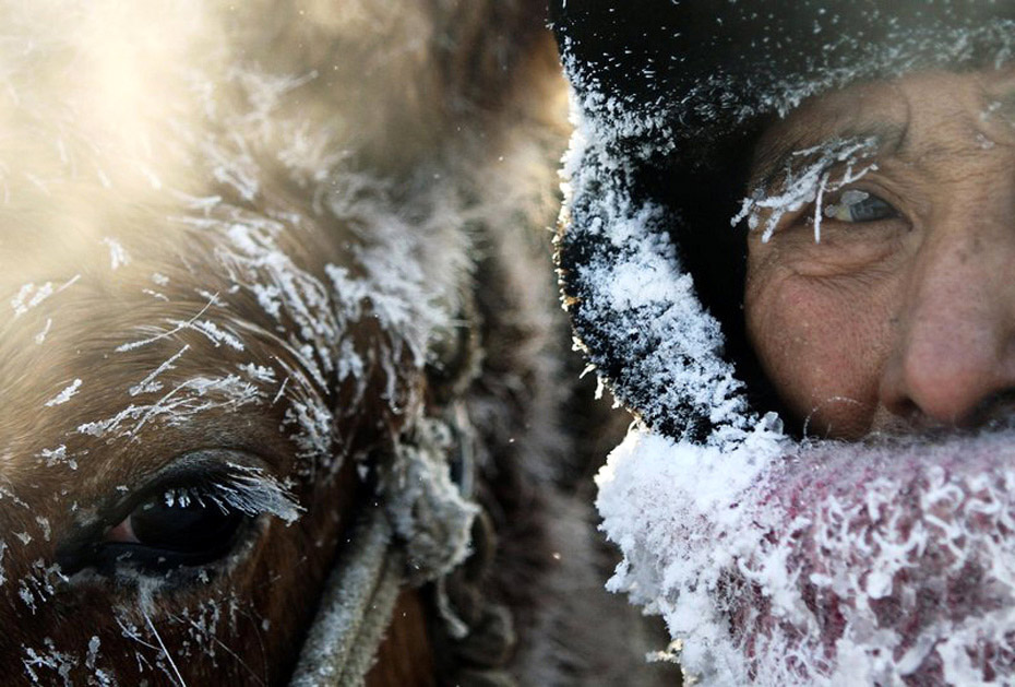 1月4日,黑龍江省安達市牲畜交易市場一農民和他的馬在寒冷的天氣中。盛紅旭 攝