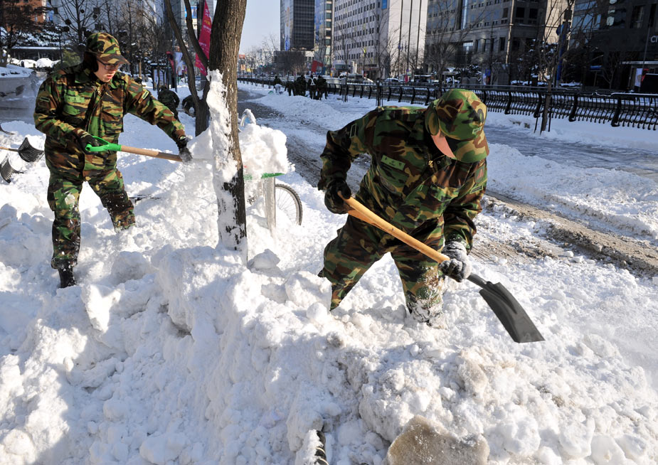 四日,韓國大部分地區遭遇大雪。至下午二時左右,首爾地區積雪厚度超過二十八厘米,這是韓國自一九三七年開始進行積雪量觀測以來的最新紀錄。圖為1月5日,韓國士兵在街頭除雪。