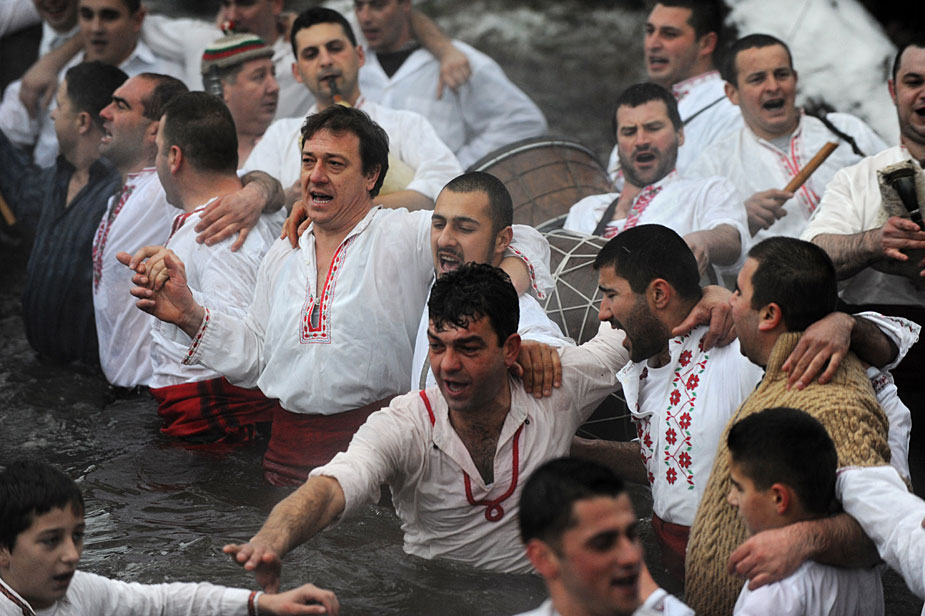 1月6日,在保加利亞卡洛菲爾市,人們在冰冷的河水中跳起保加利亞民間舞蹈霍洛舞,相互祝福在新的一年里身體健康,事事順遂。圖片來源:中國新聞網