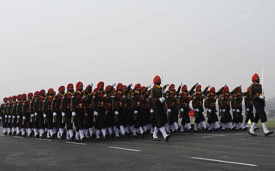 1月15日,在印度首都新德里舉行的建軍節閱兵式上,印度士兵接受檢閱。圖片來源:中國新聞網