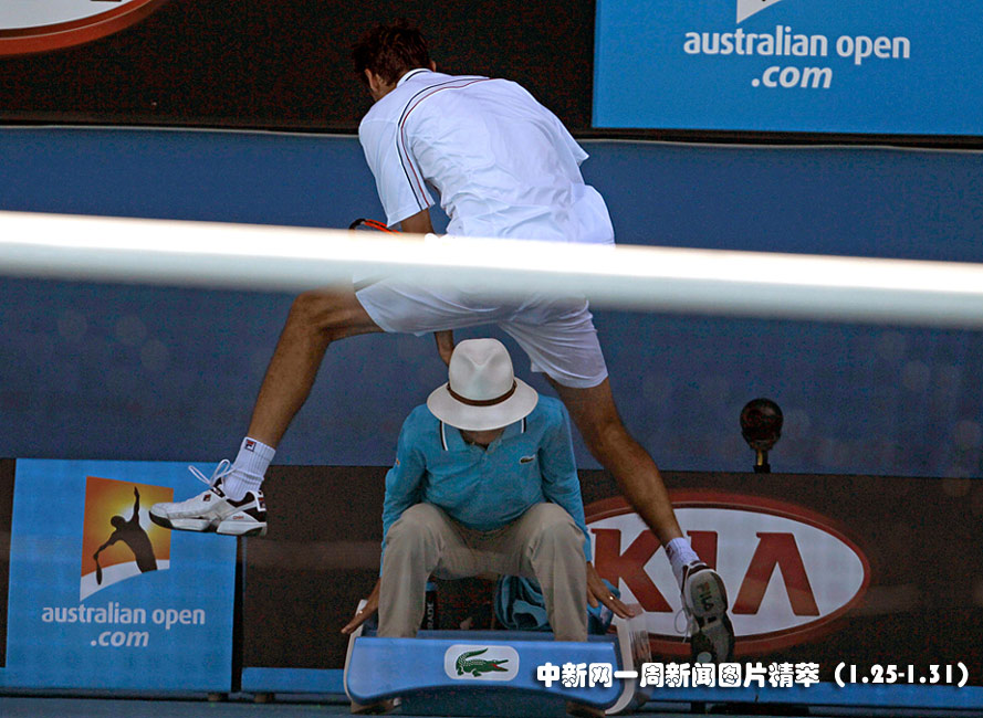 1月26日(周二),在澳網(wǎng)男子四分之一決賽上,克羅地亞選手西里奇(Marin Cilic)在對陣美國選手羅迪克(Andy Roddick)時(shí)為救球從邊裁頭頂跳過。圖片來源:中國新聞網(wǎng)
