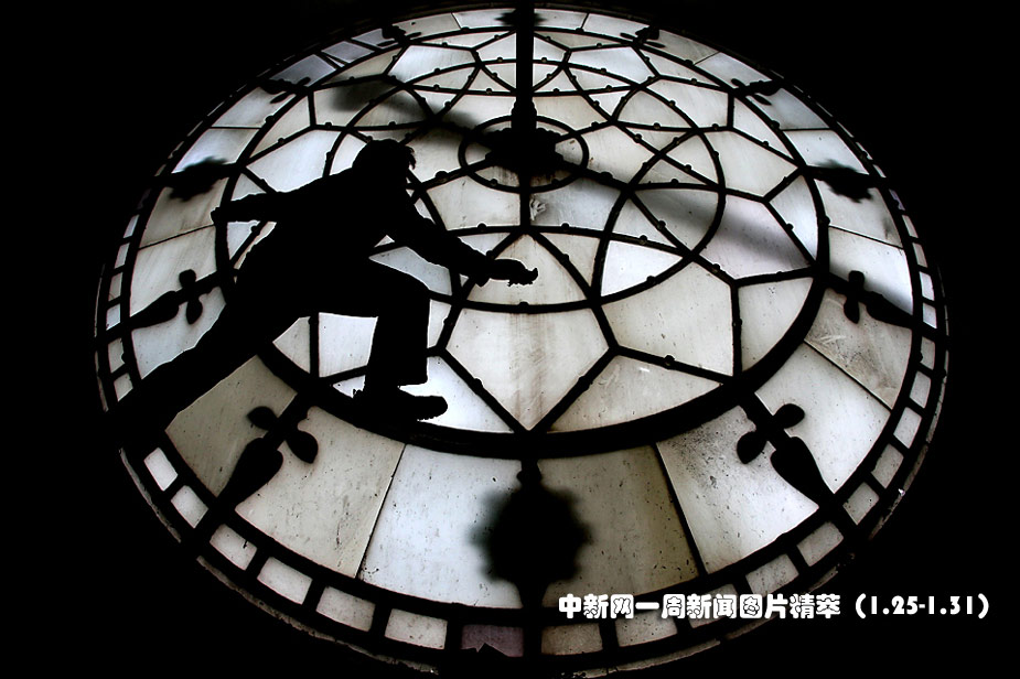 1月28日(周四),在英格蘭曼徹斯特市政廳里,鐘表專家對鐘表“Great Abel” 進行一年一度的大清理。圖片來源:中國新聞網